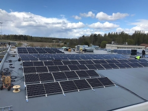 NP gruppen har installerat 250 st. solpaneler på det befintliga platta papptaket vilket resulterat i en solcellsanläggning på totalt 100 kW.